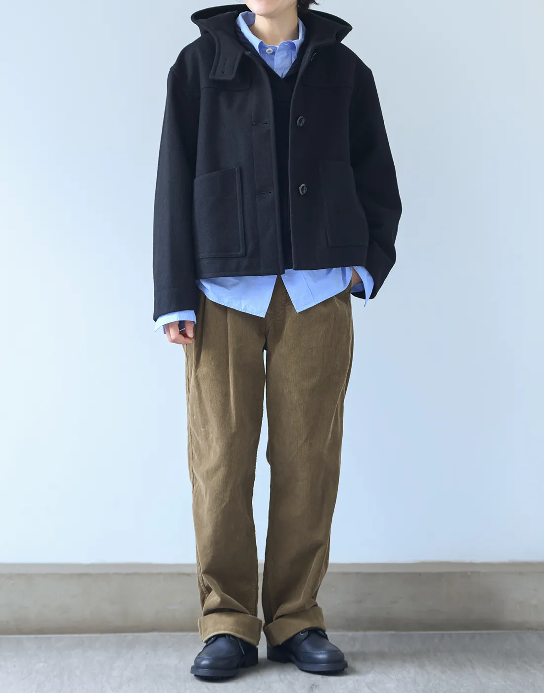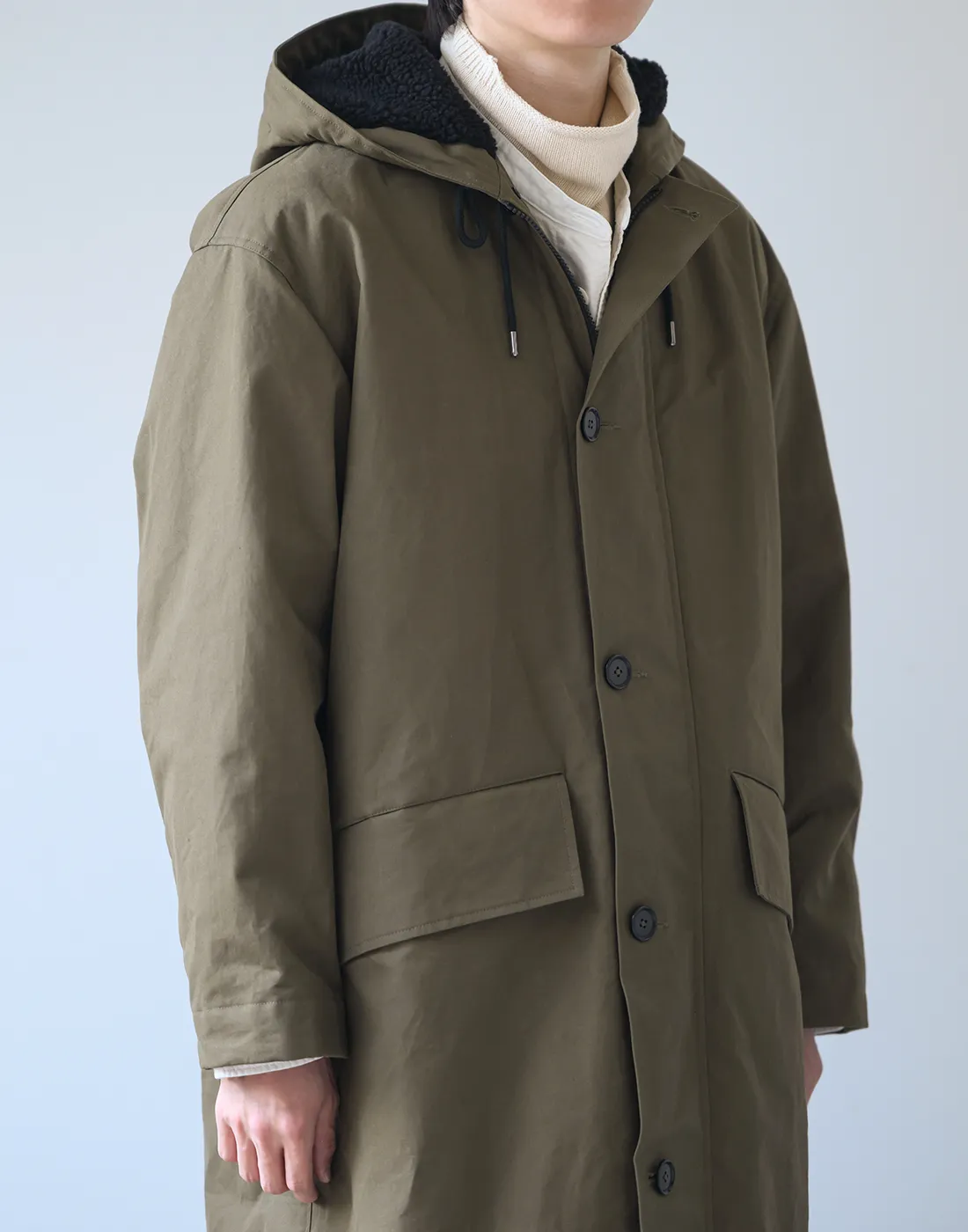 風の侵入を防ぐストームタブが付いたフードや、大きくデザインされたパッチポケットなどがコンパクトなボディにバランスよく配され、トラディショナルなイメージの強いダッフルコートを新鮮に見せてくれます。