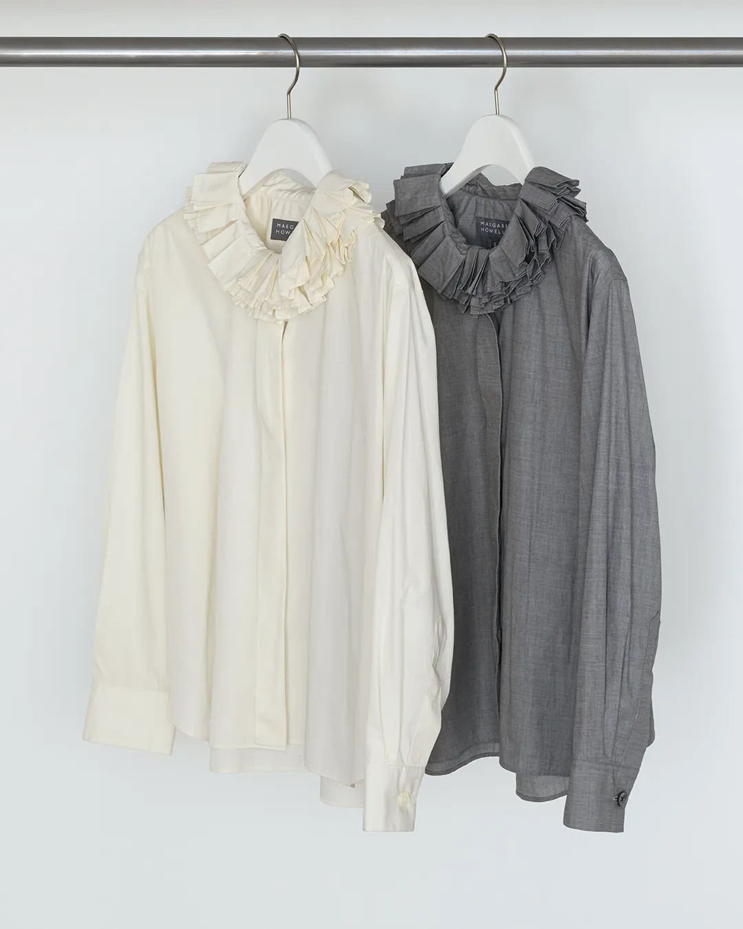 コーディネートに華やかな印象を添えるフリルカラーシャツは、シンプルなカラーリングでありながら、リラックス感のある風合いと、繊細な刷毛目が立体感のある表情をプラス。マニッシュなアイテムとのバランスを活かすのがブランドらしいスタイリング。