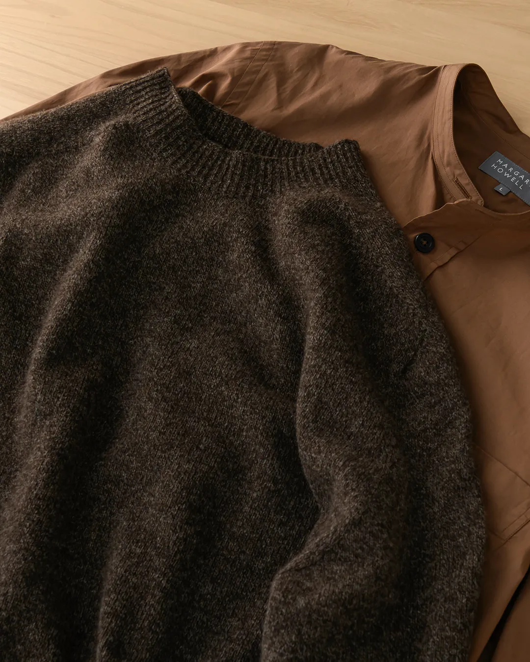 温かみのあるブラウンは自然にアクセントを加えられるオーセンティックなカラー。スコットランドのファクトリーで編み立てられたホールガーメントのニットウエアとブランドらしいシンプルなデザインのシャツ。