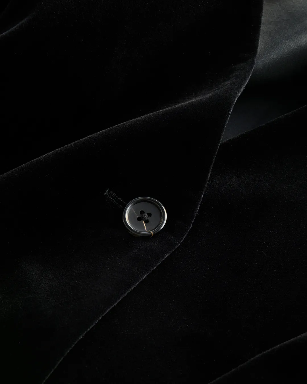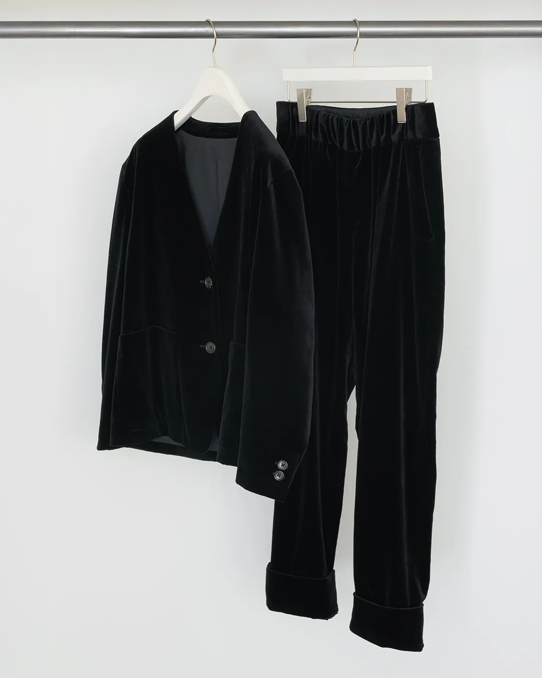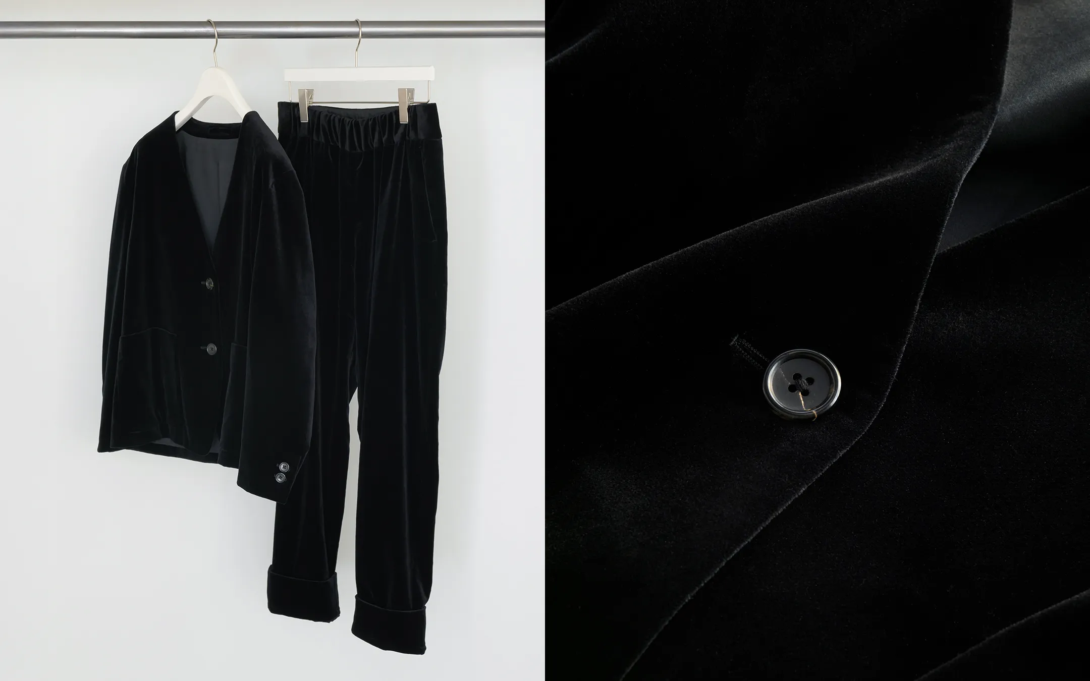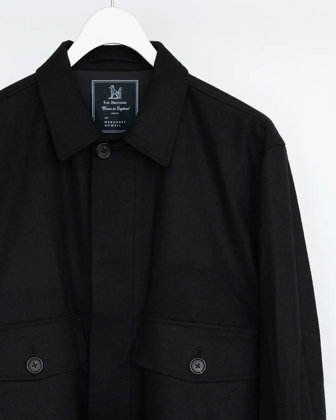 メンズのブラックファブリックコレクションを代表するリラックスジャケットは、フォックスブラザーズ社製のフランネルを採用。裾のゴムシャーリングやフラップポケットなど、カジュアルなディテールと上質な素材のバランスがブランドらしいアイテム。