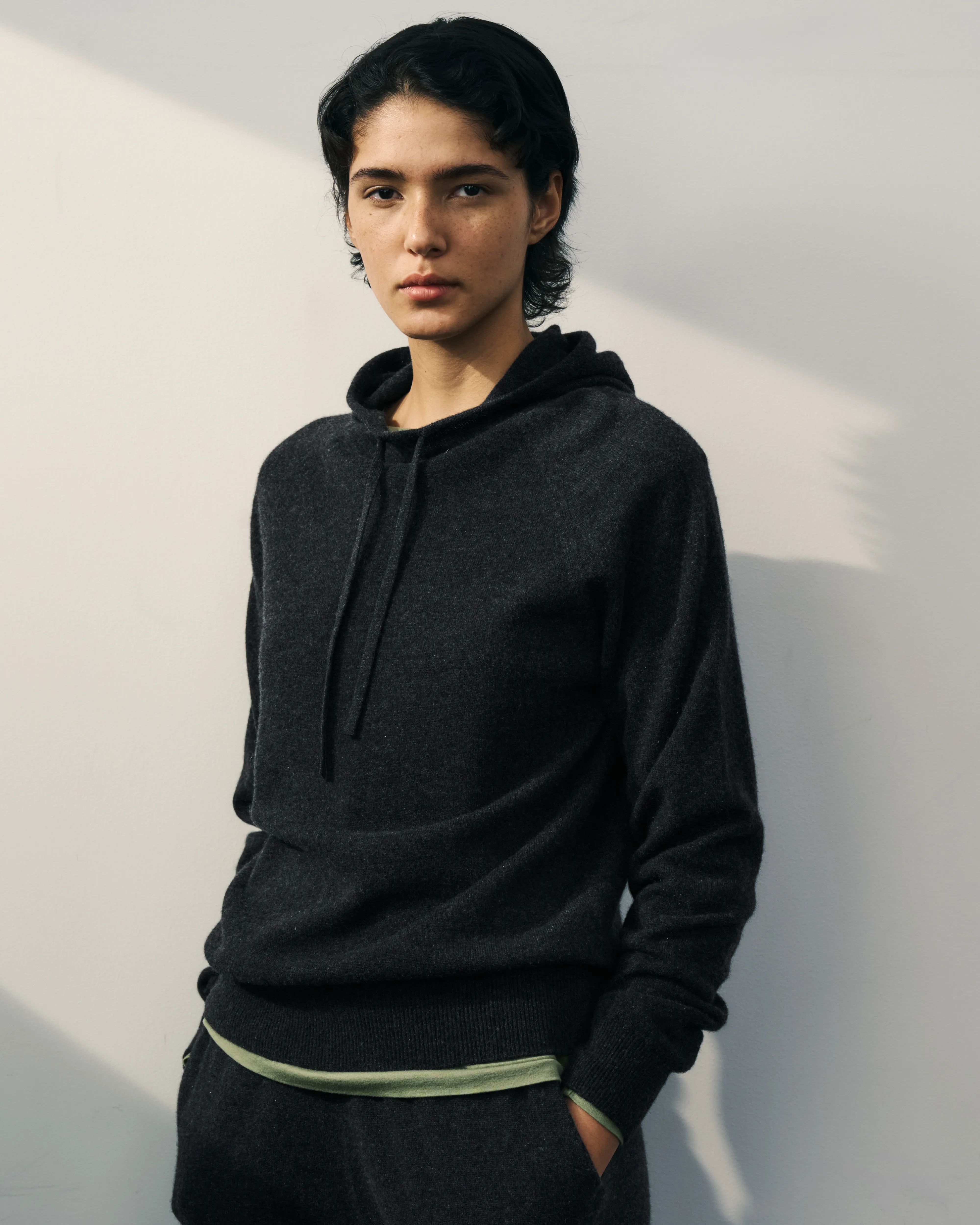 平均16ミクロンのピュアカシミヤを使用。トップ染めによる奥行きのある色合いと、柔らかく包み込むような肌ざわりが特徴です。直接素肌に着ても心地よく、上質なぬくもりを感じられるシリーズ。ホールガーメントで編み立てたフーディとトラックパンツ。縫い目のない構造で、軽く自然な着心地です。肌ざわりも柔らかで、カシミヤ素材がカジュアルなデザインを穏やかに引き立てます。