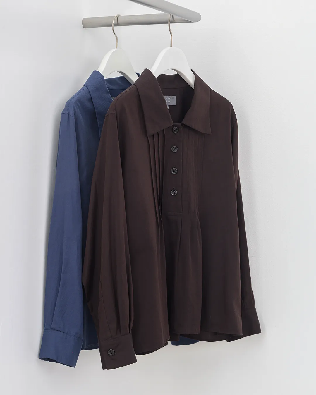 滑らかなツイル素材が生み出す控えめな光沢としなやかな落ち感のシャツは、深みのあるカラーが際立つミニマルな表情。UKスタイルのバックタイドレスをベースに、繊細なピンタックと低めに配したワイドカラーが、構築的でありながらも女性らしいニュアンスをプラス。