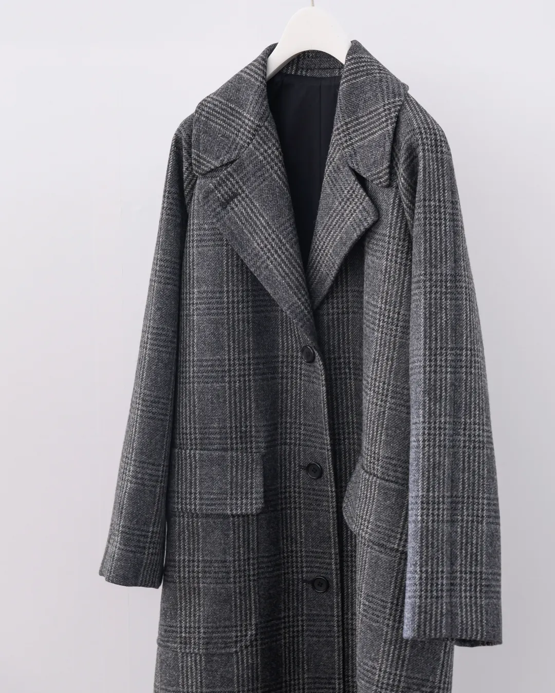 メンズのコートを女性が着た時のようなリラックス感を表現したコート。贅沢な生地の分量とオーセンティックなグレンチェックがマニッシュなフィーリング。ラグランスリーブと大きなポケット、ラペルのディテールが全体のアクセントに。