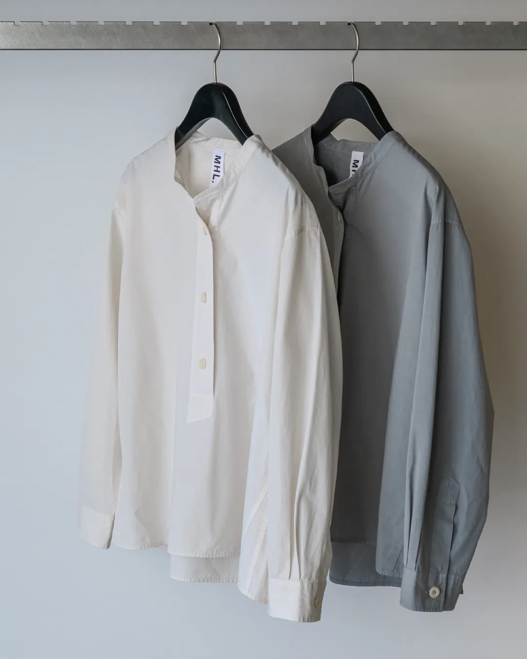 長くMHL.で愛されるスウィングシャツ。しなやかさとしっかりした厚みを併せ持ちながら、適度に光沢を抑え、落ち着いたカジュアルさを表現。幅広いスタイルに馴染み、使い込むほどに深みが増す風合いが魅力。