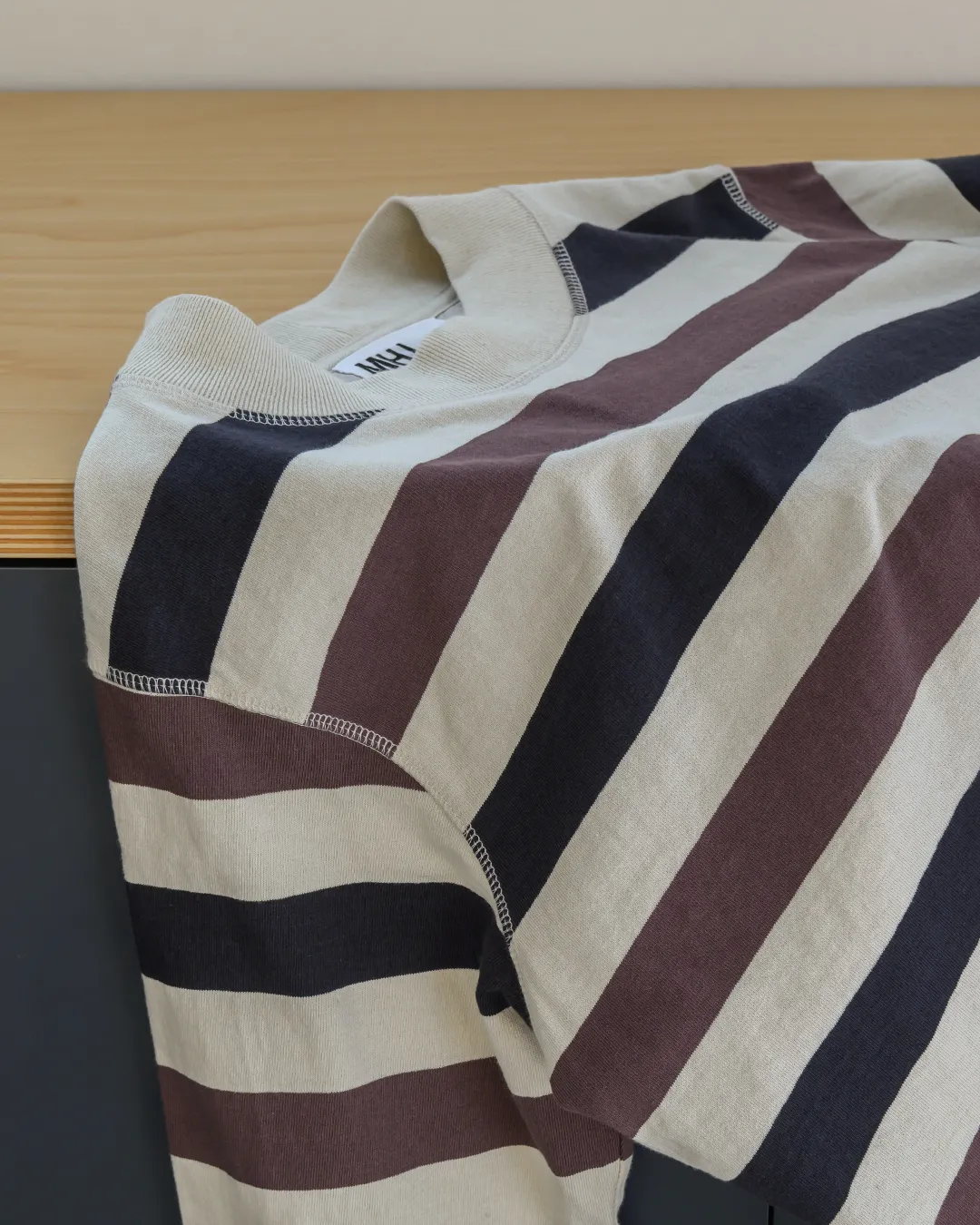 ドライなタッチと軽く柔らかな風合いを併せ持ったリラックス感のある素材。ワイドピッチのストライプは、繊細に色を重ねたニュアンスのある配色が魅力。日常のスタイリングに新鮮な空気を添える一枚。