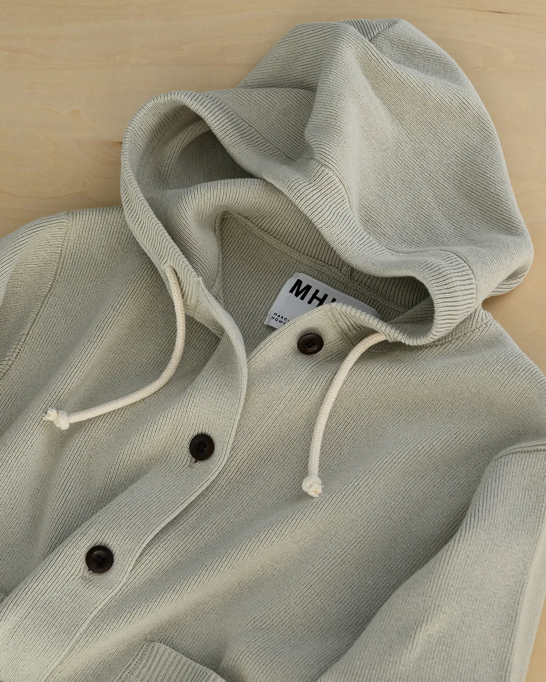 端正なボタン開きとフードのバランスがブランドらしいカーディガン。腰にダブルポケットを配しながら、ニットならではの上品な印象がスタイリングにさり気ないアクセントを添える。