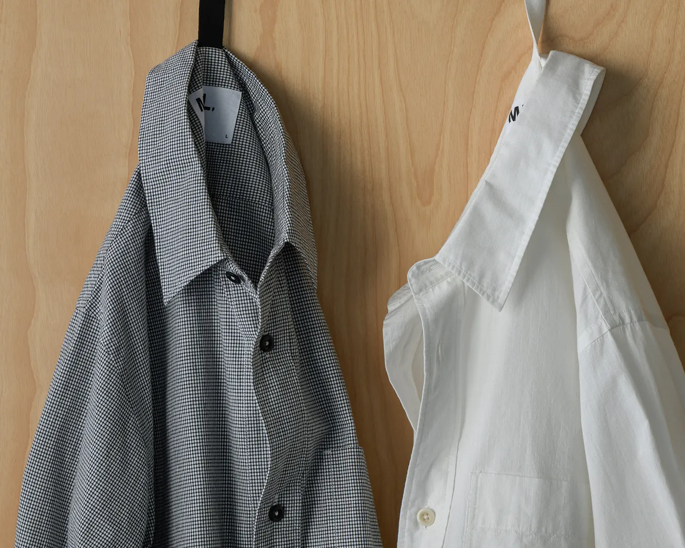 コットンの自然な風合いと、糸を格子状に組み合わせてギンガムチェックを表現したこだわりの素材。ホワイトは繊細に浮かぶ控えめな格子がさり気ないキャラクター。ウィメンズは定番のスウィングシャツ、メンズはリラックス感のあるベーシックなデザイン。