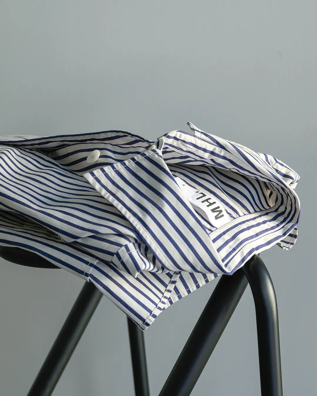 ヴィンテージシャツから着想を得たワークストライプ。高密度に織り上げた上品な素材に、あえて特殊な柔軟加工を施し肌なじみの良い仕上がりに。全体をニュアンスのあるグレイッシュなカラーリングでまとめた一枚。