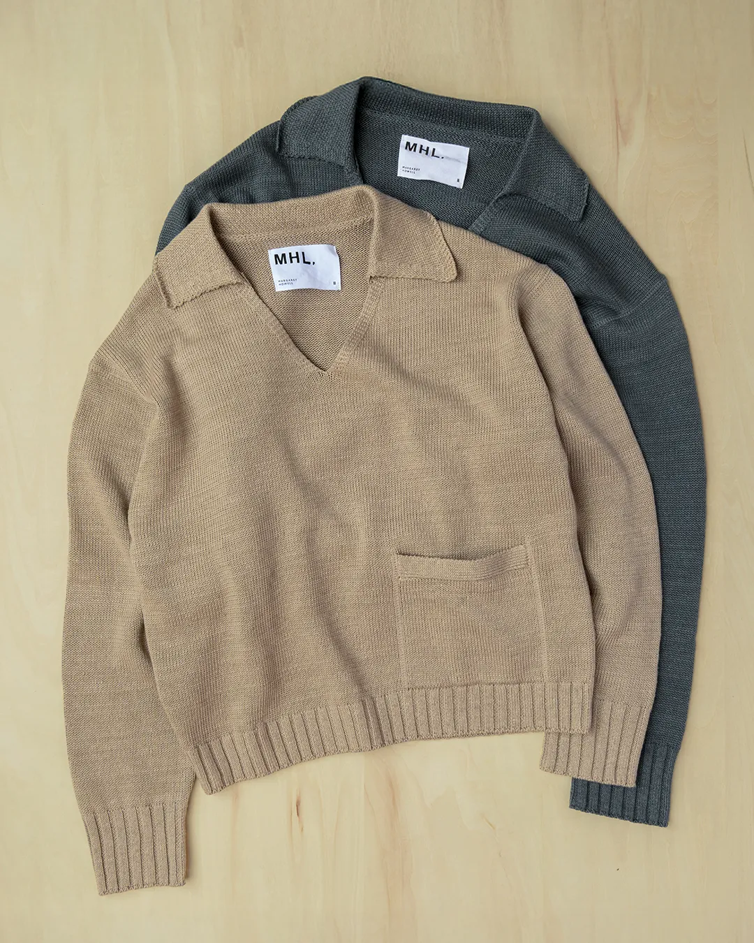 コットンとリネンそれぞれの風合いをいかしたスキッパーデザインのニット。シンプルながら、奥行きのある編地の表情、襟のラフな抜け感が全体にヴィンテージのような雰囲気を醸し出す。アクセントのポケットがブランドらしさをプラス。