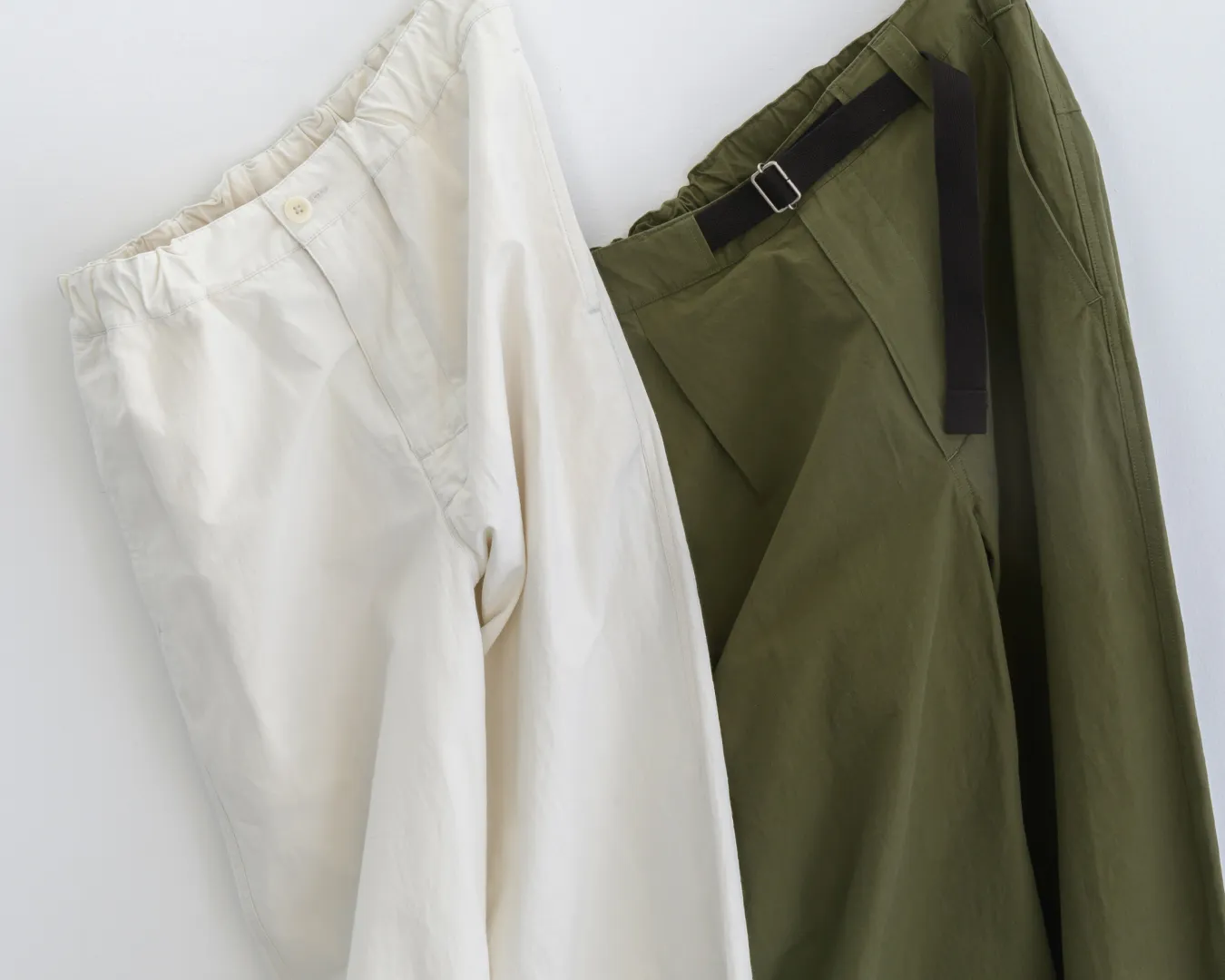 薄手でハリのあるドライな風合いのトラウザーズ。国内の伝統的なワッシャー加工を施し、上品な印象を残しながらもヴィンテージライクに仕上げた一本。ウィメンズはタックインした際の腰まわりに表情が生まれるドローストリング仕様に、メンズはウエストテープを用いて実用的なディテールを配したデザイン。