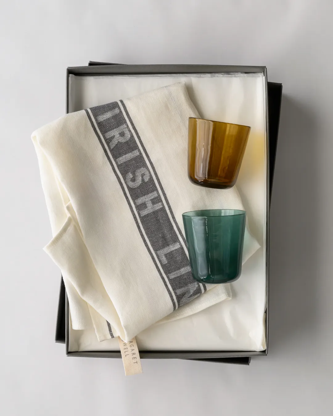 大阪府和泉市のガラス工房「fresco」で1点1点ハンドメイドで作られたグラスと、高品質なリネン製品を得意としている歴史のあるファクトリー「ファーガソン社」へスペシャルオーダーしたアイリッシュリネンのティータオル。
