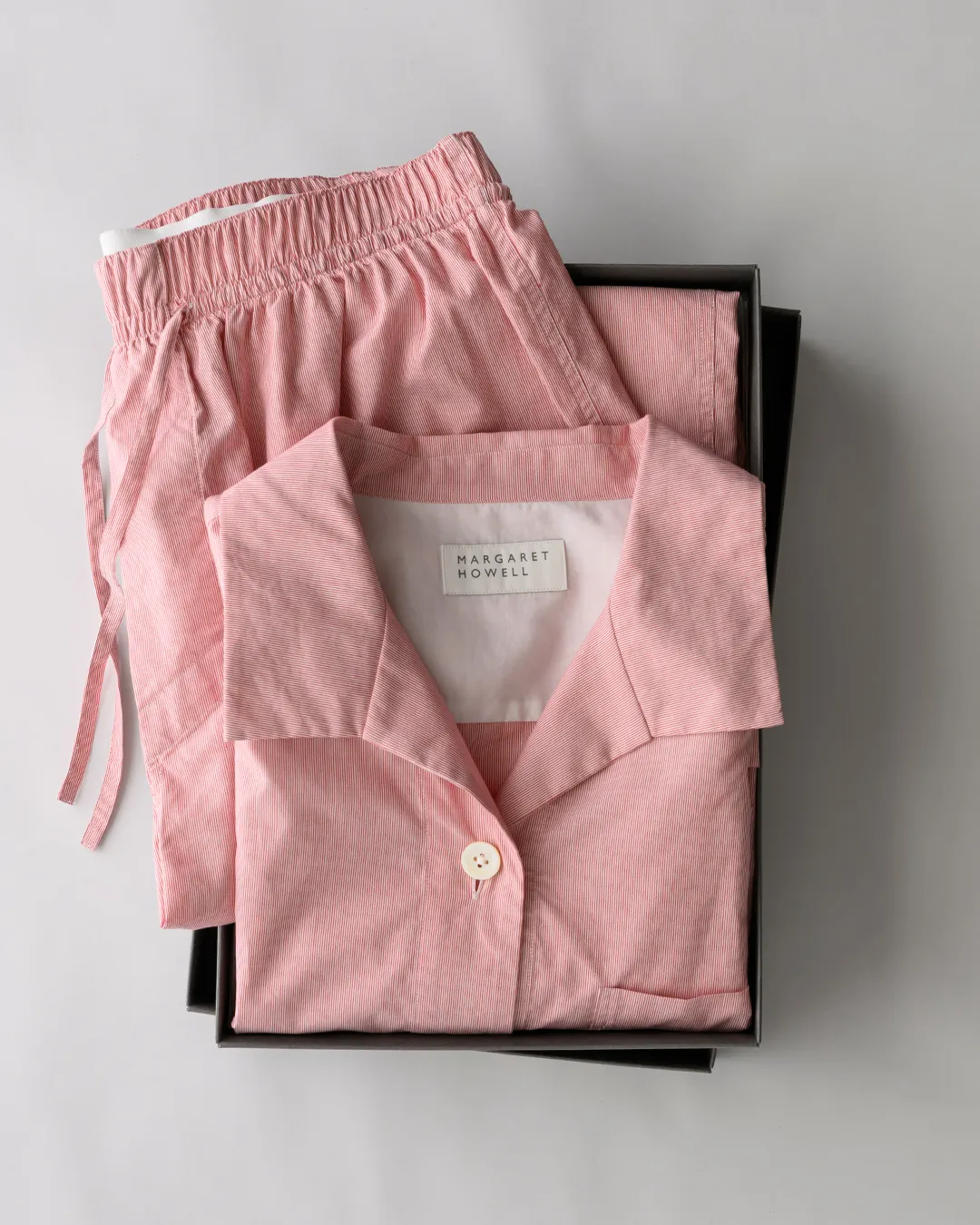 細番手の糸を使い密度高く織り上げたコットンパジャマ。毛羽を削ぎ落としたクリーンな表情と、さらりとした肌触りが、日常のひとときを心地よく。