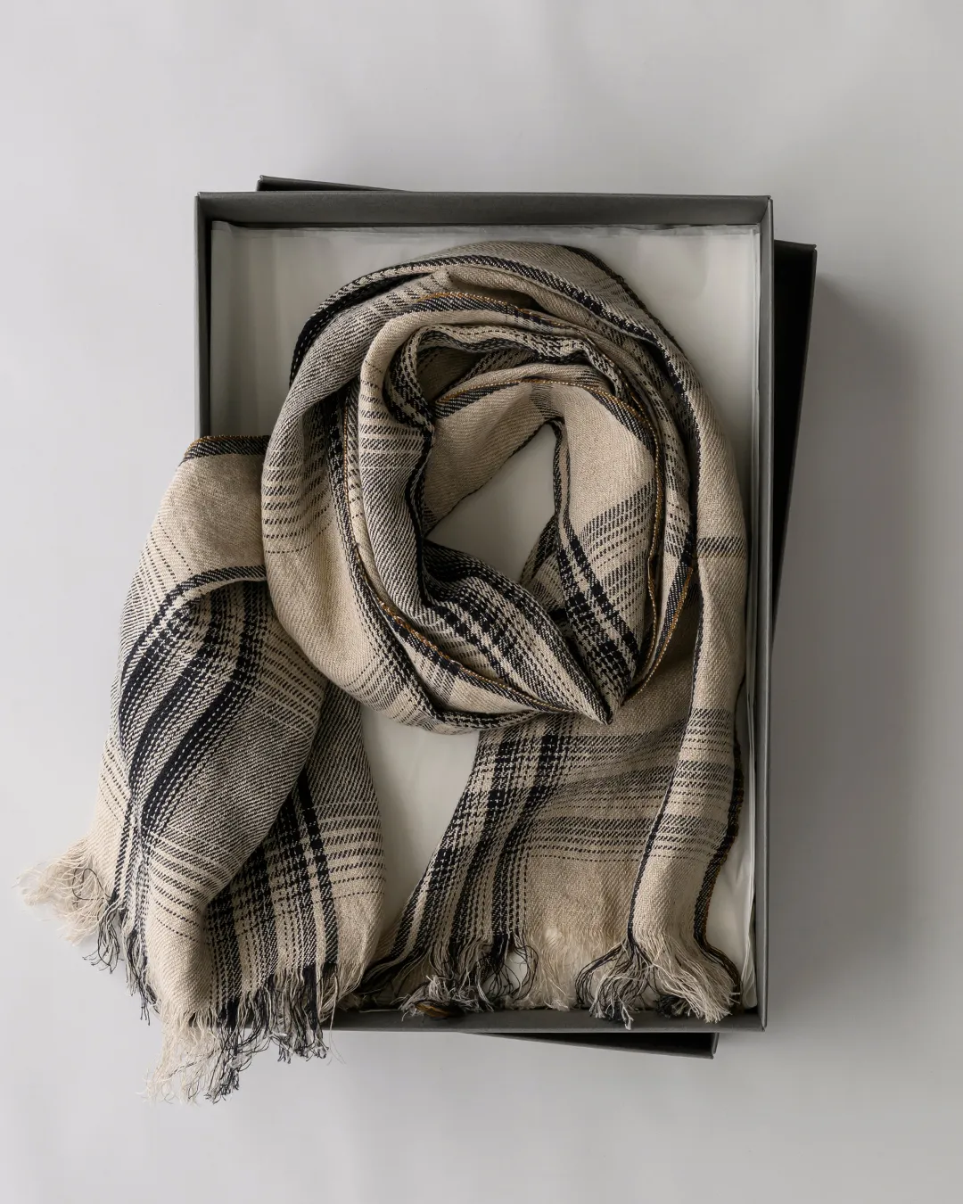 英国らしいグラフィックチェックのリネンスカーフ。一枚ずつ職人が手で織り上げるハンドウィーブならではのニュアンスある仕上がり。