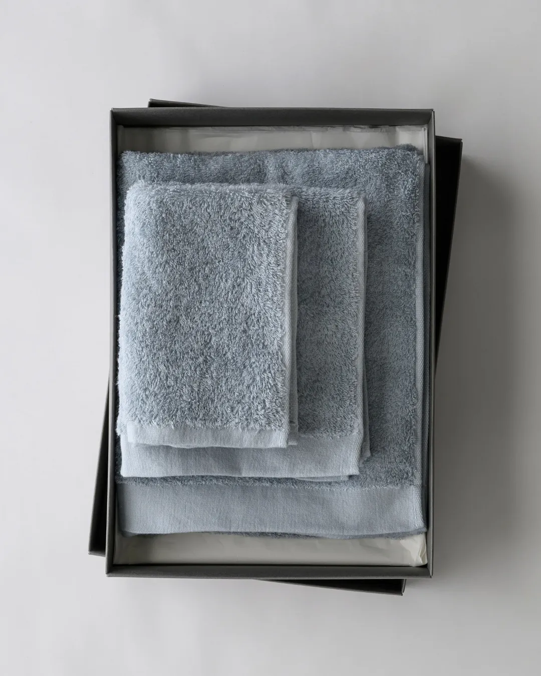 日本有数のタオル産地、愛媛県今治の工場で生産されたシリーズ。 コットンの吸水性とラミーの速乾性をあわせ持ち、さらりとした肌触りが心地よい仕上がりのオリジナル素材のタオル。
