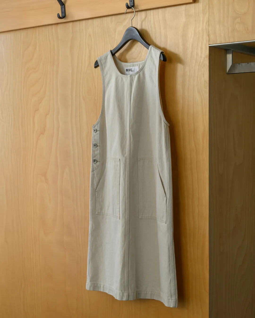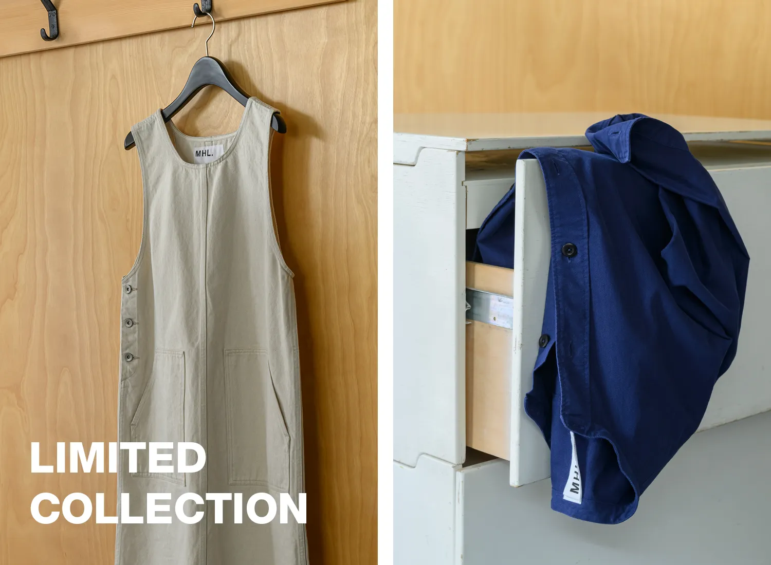 MHL.ルミネ全店舗限定で、ヴィンテージのデニムドレスから着想を得たノースリーブデザインのワンピースとワークウエアから着想を得た腰回りがルーズなフィット感で膝から裾にかけ少しテーパードしたシルエットが特徴のトラウザーズを展開。