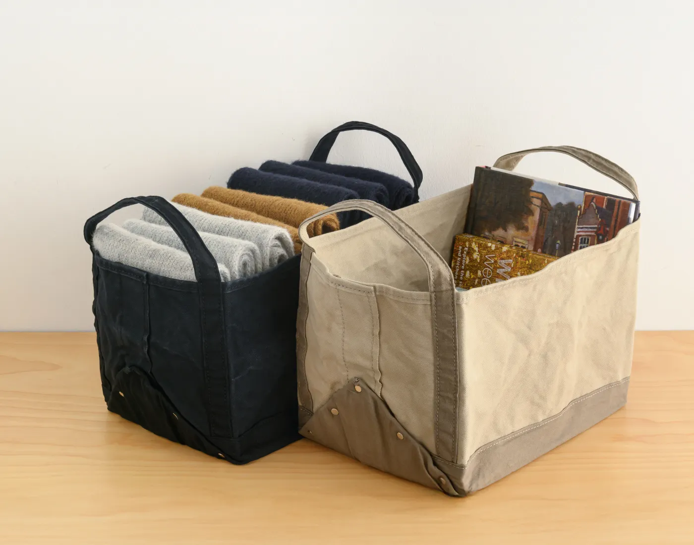 TEMBEAのアイコニック的な存在のBOOK TOTE。重いものを持ち運びやすい持ち手のデザインやサイズ感はそのままに、三角の外マチにリベットを備えることで、MHL.らしさをプラス。製品洗いをかけたパラフィン加工のキャンバス生地を使用することで、エイジングも楽しめます。雑誌や洋書はもちろん、レコードや衣服、生活雑貨の収納など、ライフスタイルに合わせて使い方が広がるアイテムです。