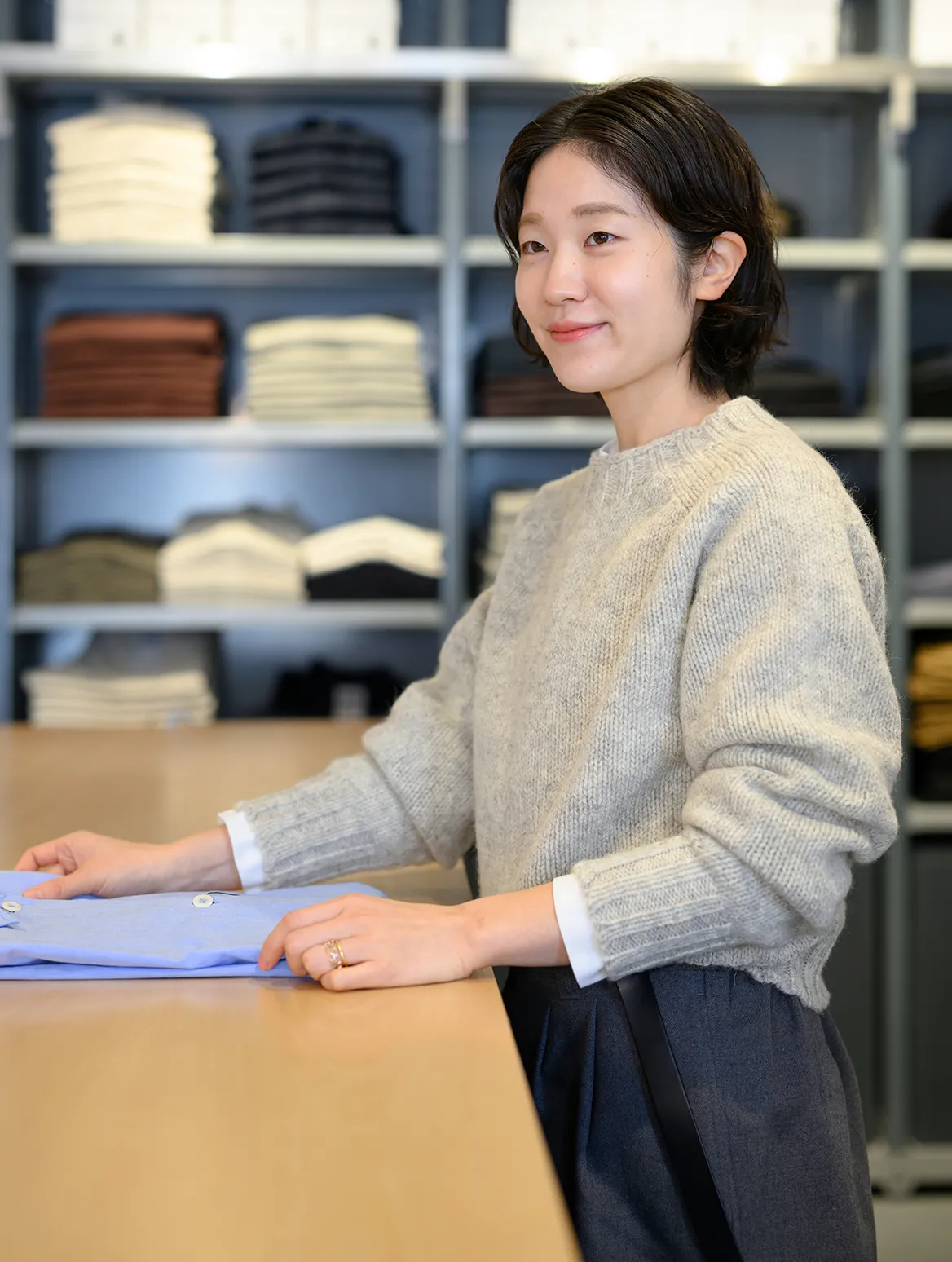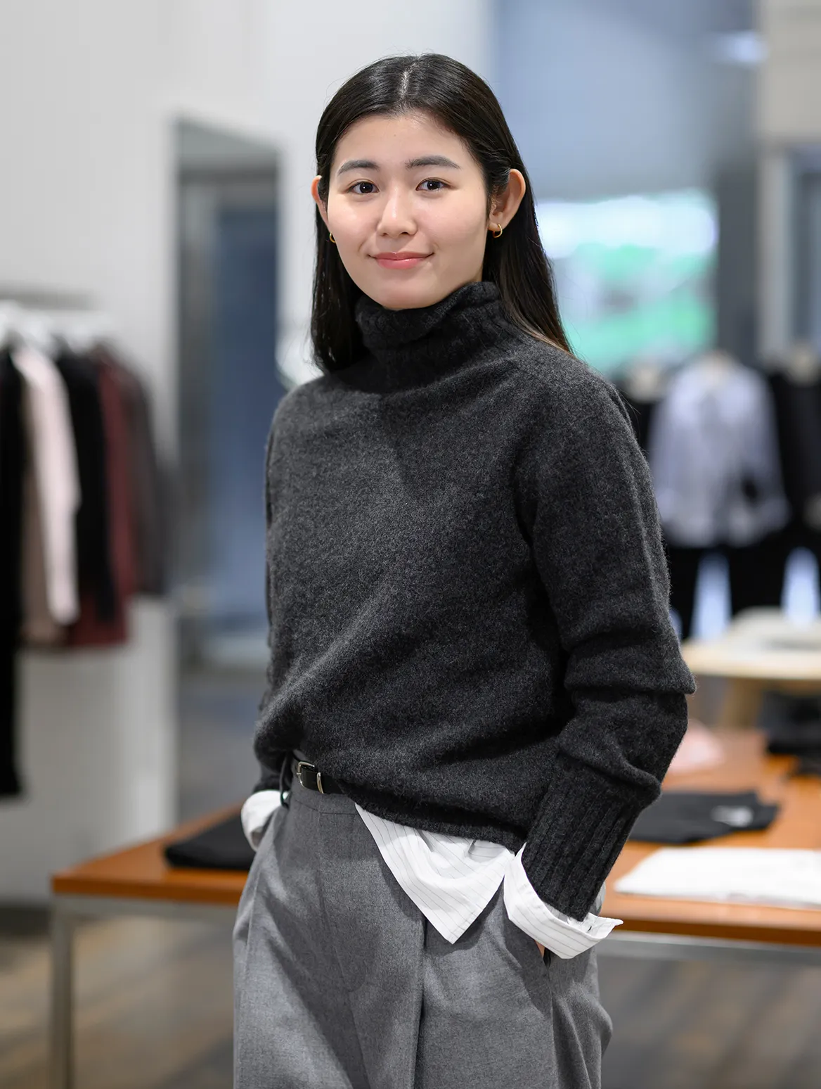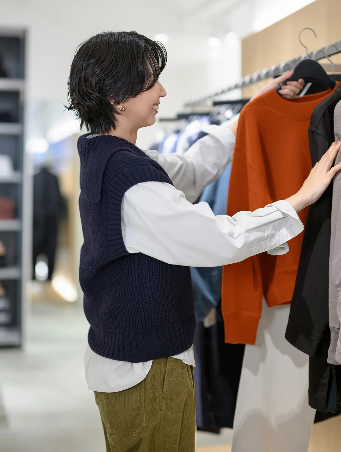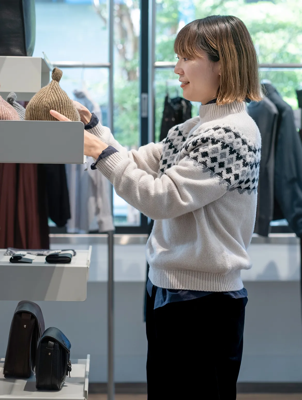 ショップスタッフが自分のスタイルで着こなしたAW25シーズンのニットコレクション。上質な糸と風合いにこだわり、シルエットやディテールにモダンな感性を加えたニットウエアは、日常に溶け込みながら着る人の個性を引き立てる。
