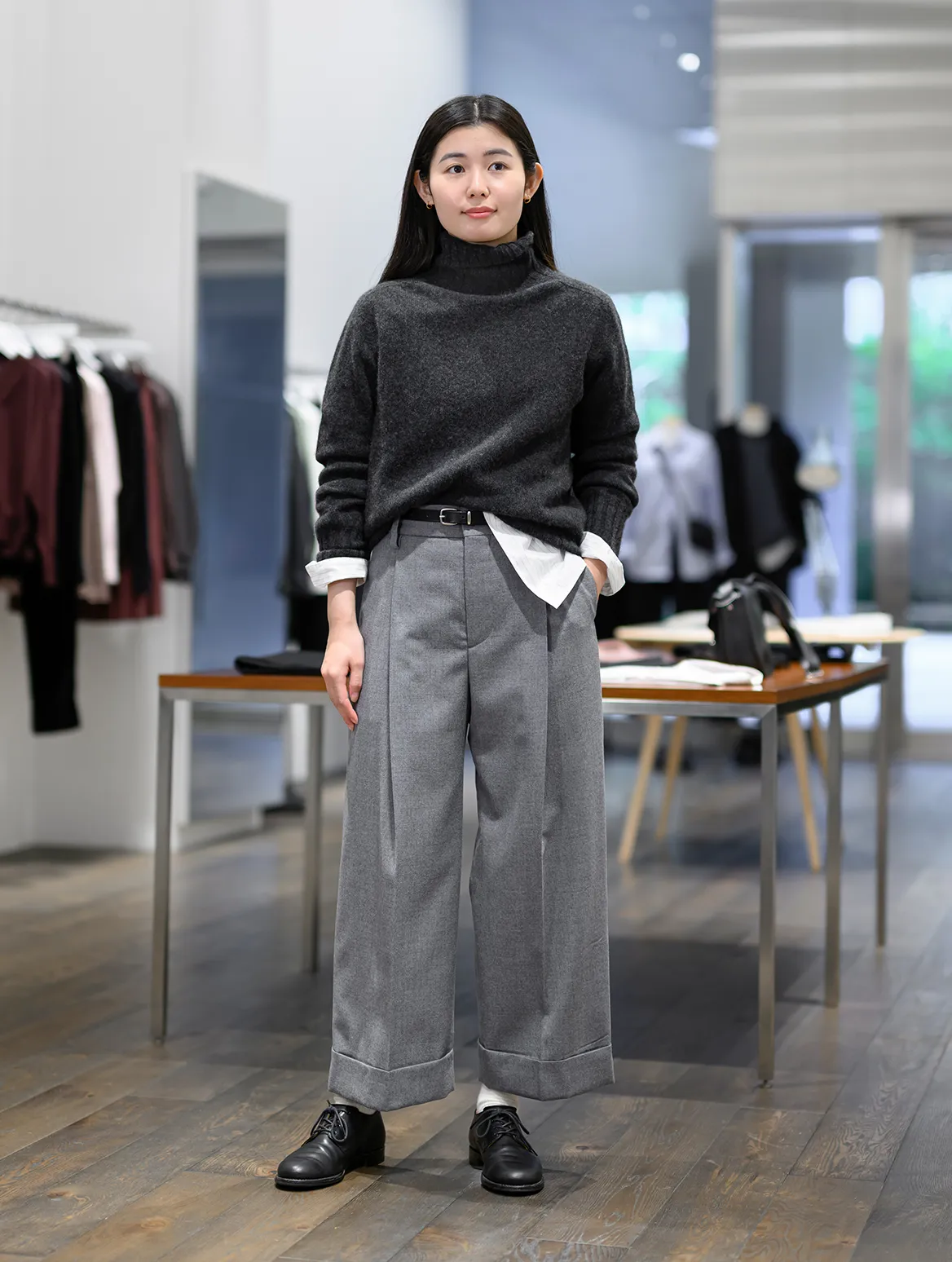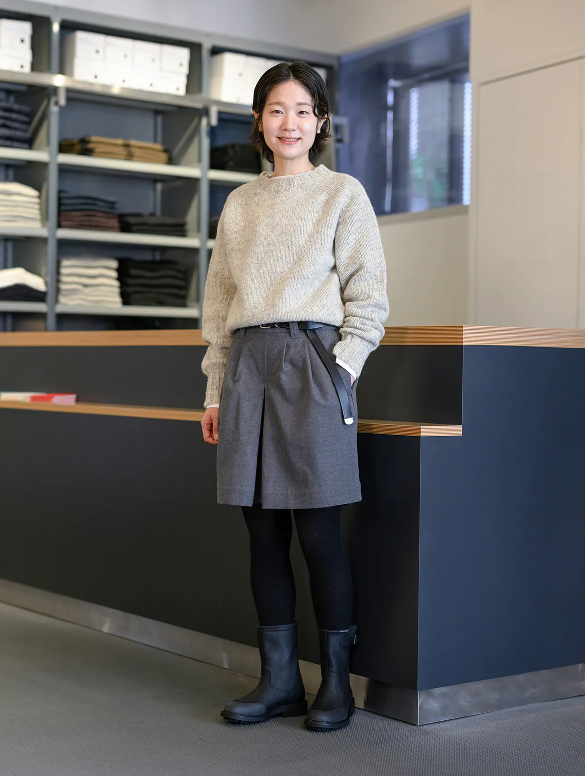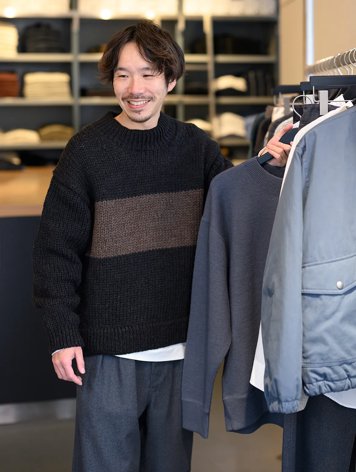 ショップスタッフが自分のスタイルで着こなしたAW25シーズンのニットコレクション。上質な糸と風合いにこだわり、シルエットやディテールにモダンな感性を加えたニットウエアは、日常に溶け込みながら着る人の個性を引き立てる。
