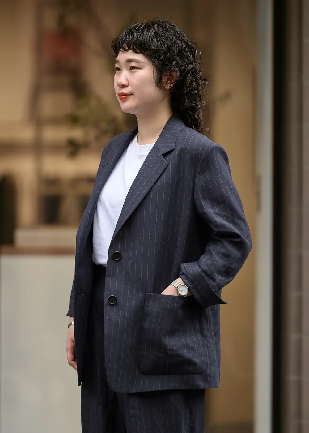 ウィメンズからリネンのセットアップが登場。ネイビーをベースにグレーのピンストライプが入る、マニッシュなイメージ。素材本来のナチュラルさも感じられるこれからの時期にぴったりな薄手の素材感です。