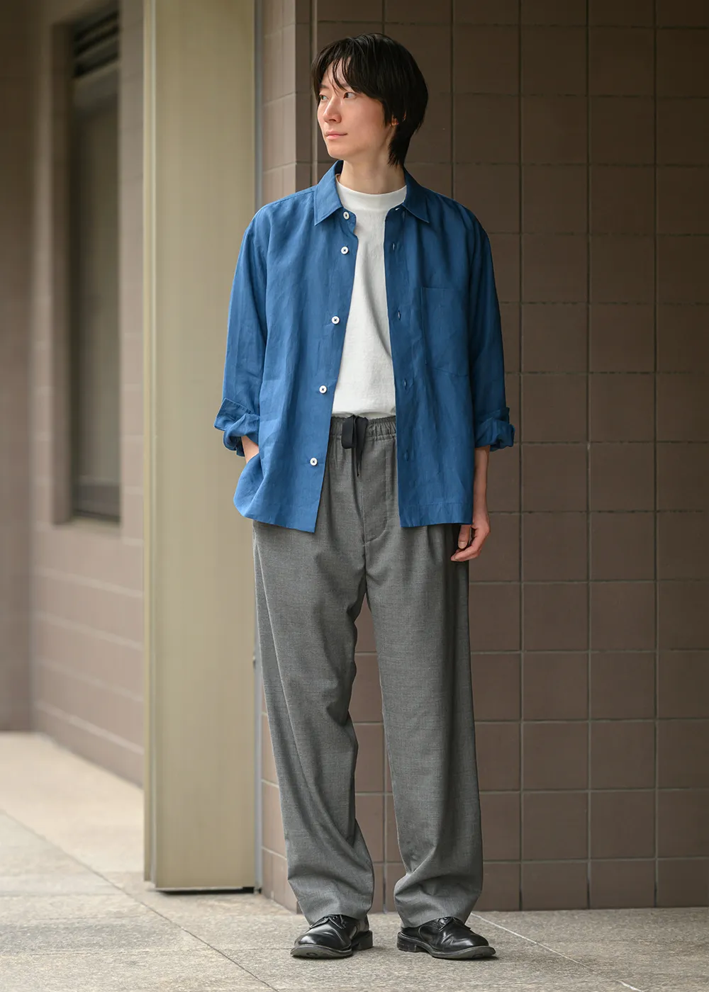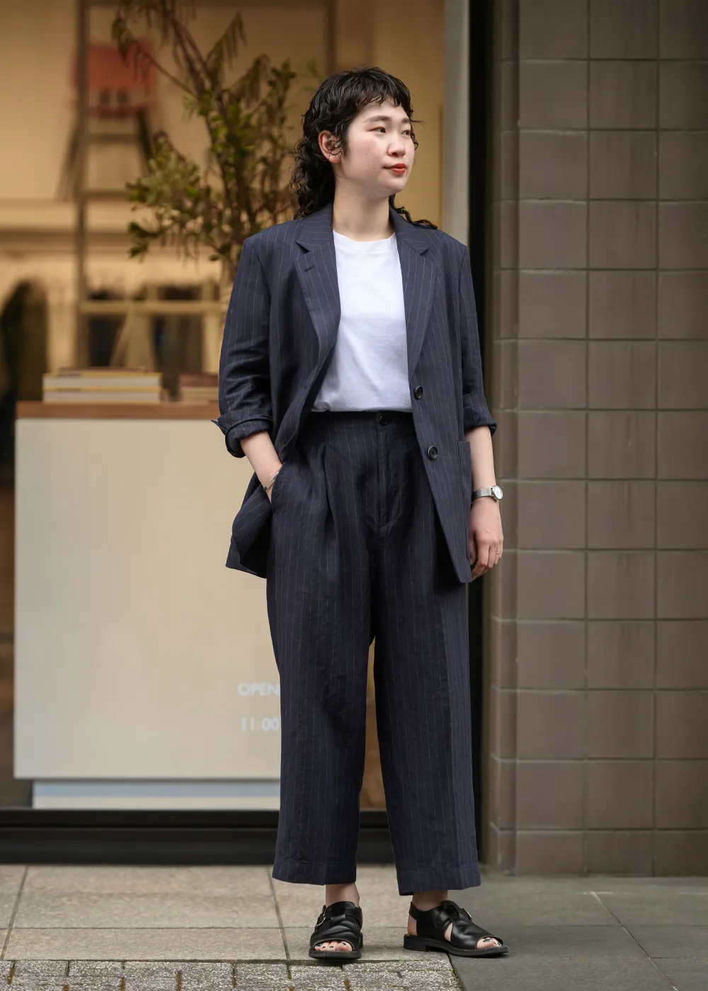 ジャケットは、ややロング丈のボクシーなシルエットでモダンな印象。トラウザーズはサイドから後ろ身頃にかけてウエストにゴムを通したリラックス感のあるスタイルに。フロントに深めのプリーツが入り、裾にかけてゆるやかにテーパードしたシルエットになっています。あえてTシャツやサンダルと合わせたスタイリングが、清涼感のある素材やストライプの柄とマッチします。