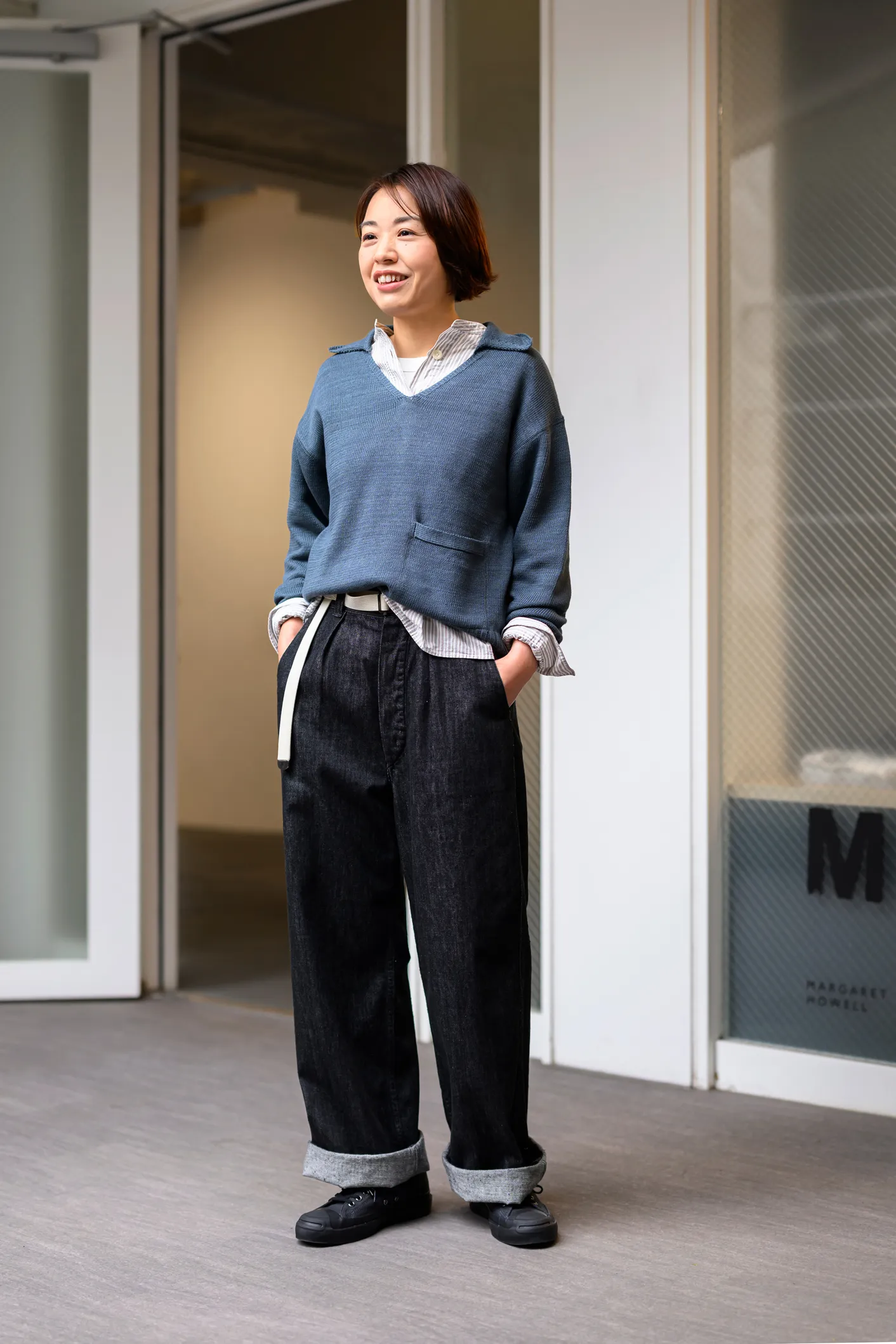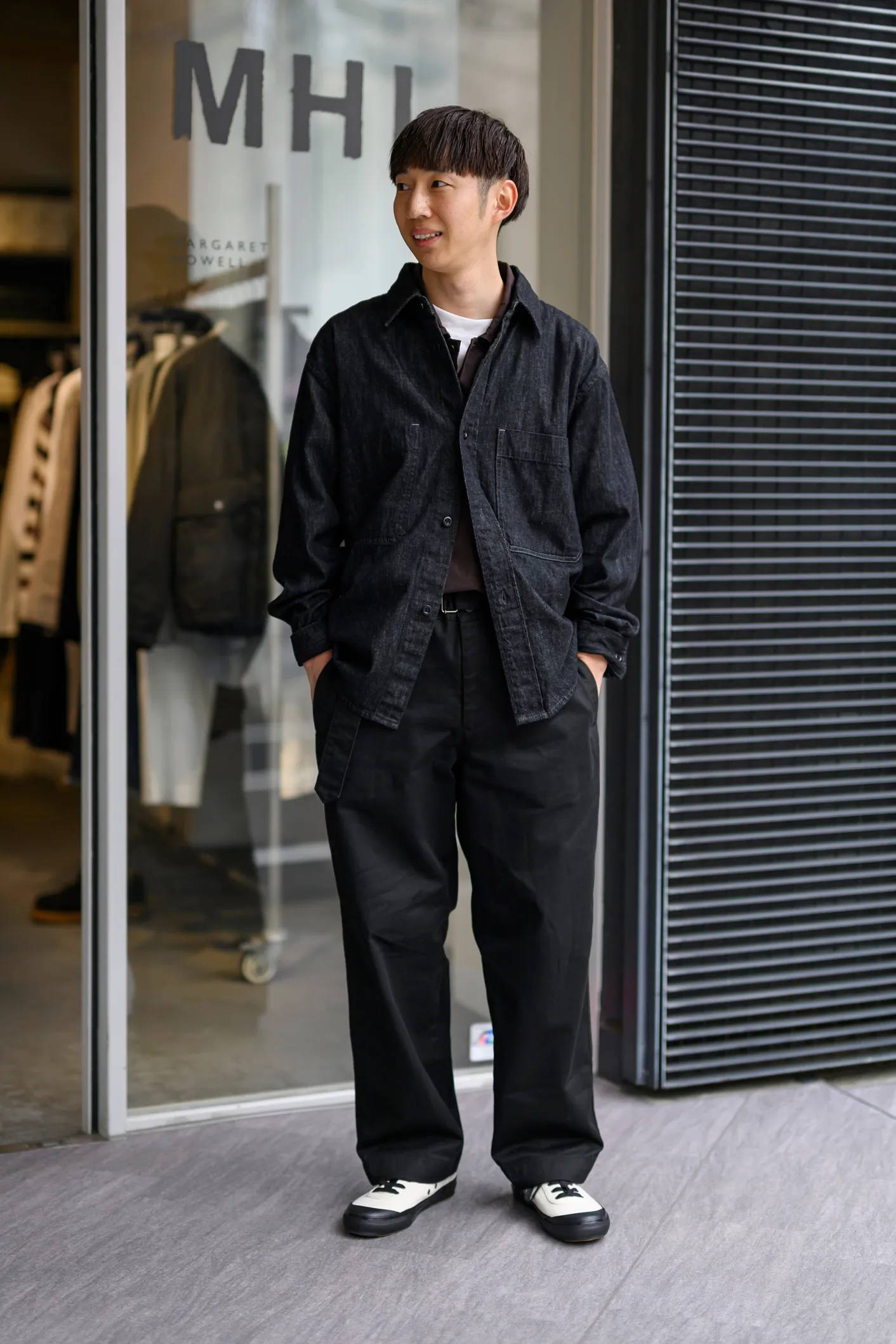 どのようなスタイルにも合わせやすいCANTON OVERALLS FOR MHL.をショップスタッフが自身の個性を生かしたスタイリングで提案。