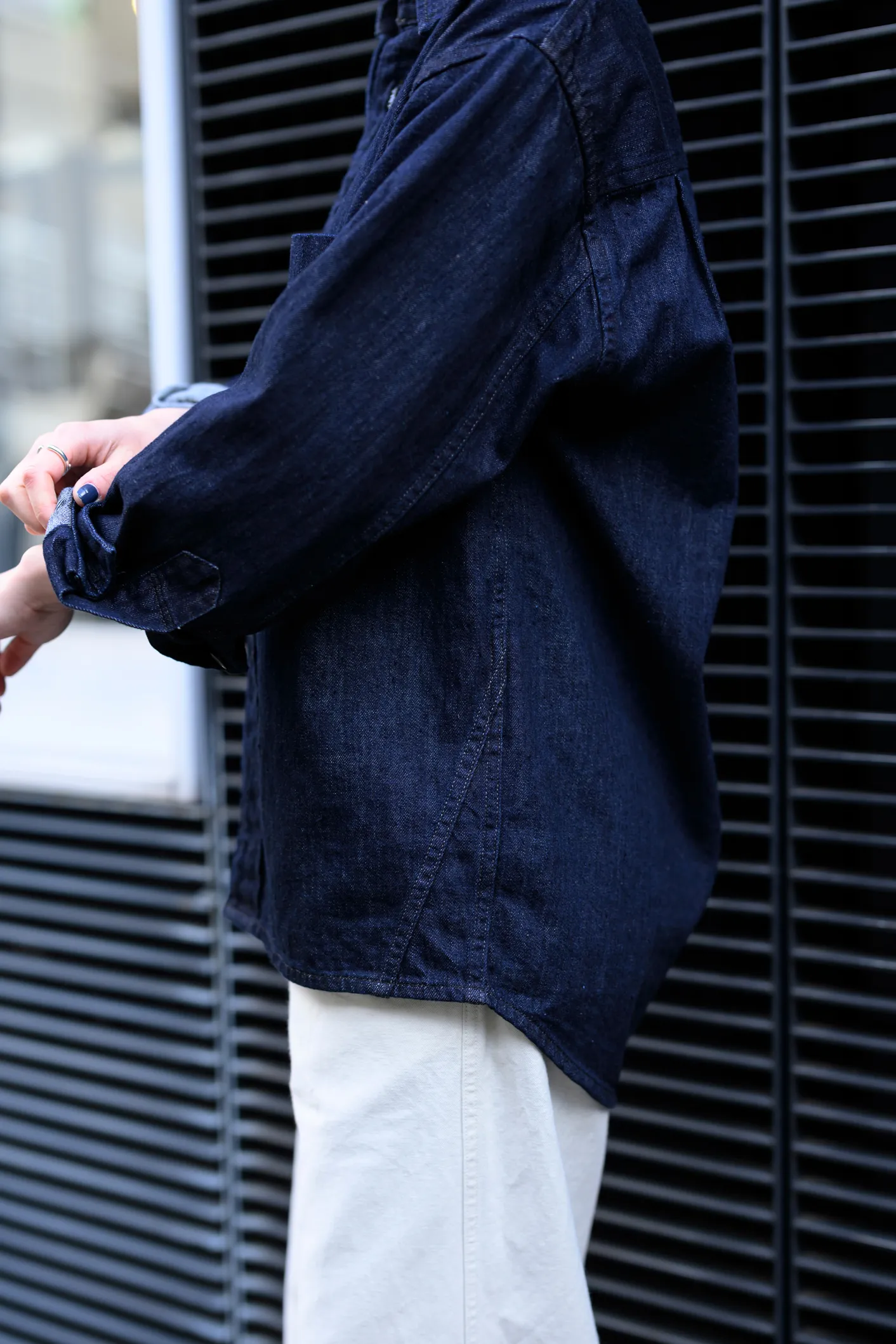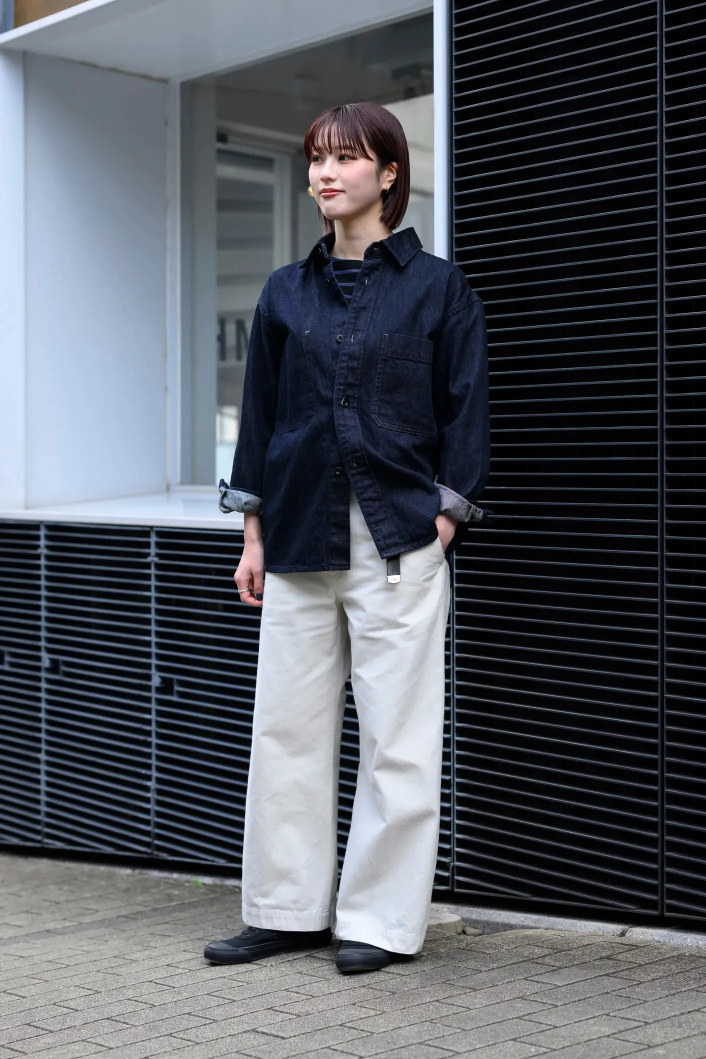 インディゴとホワイトで、春夏らしい爽やかさを意識したスタイリング。CANTON OVERALLSのデニムシャツは、ワークウエアらしさがありつつもクリーンな印象で、カジュアルになりすぎず着られるのがポイントです。一枚で存在感があるので、他のアイテムはシンプルにまとめています。 LIGHT DENIM SHIRT ¥39,600