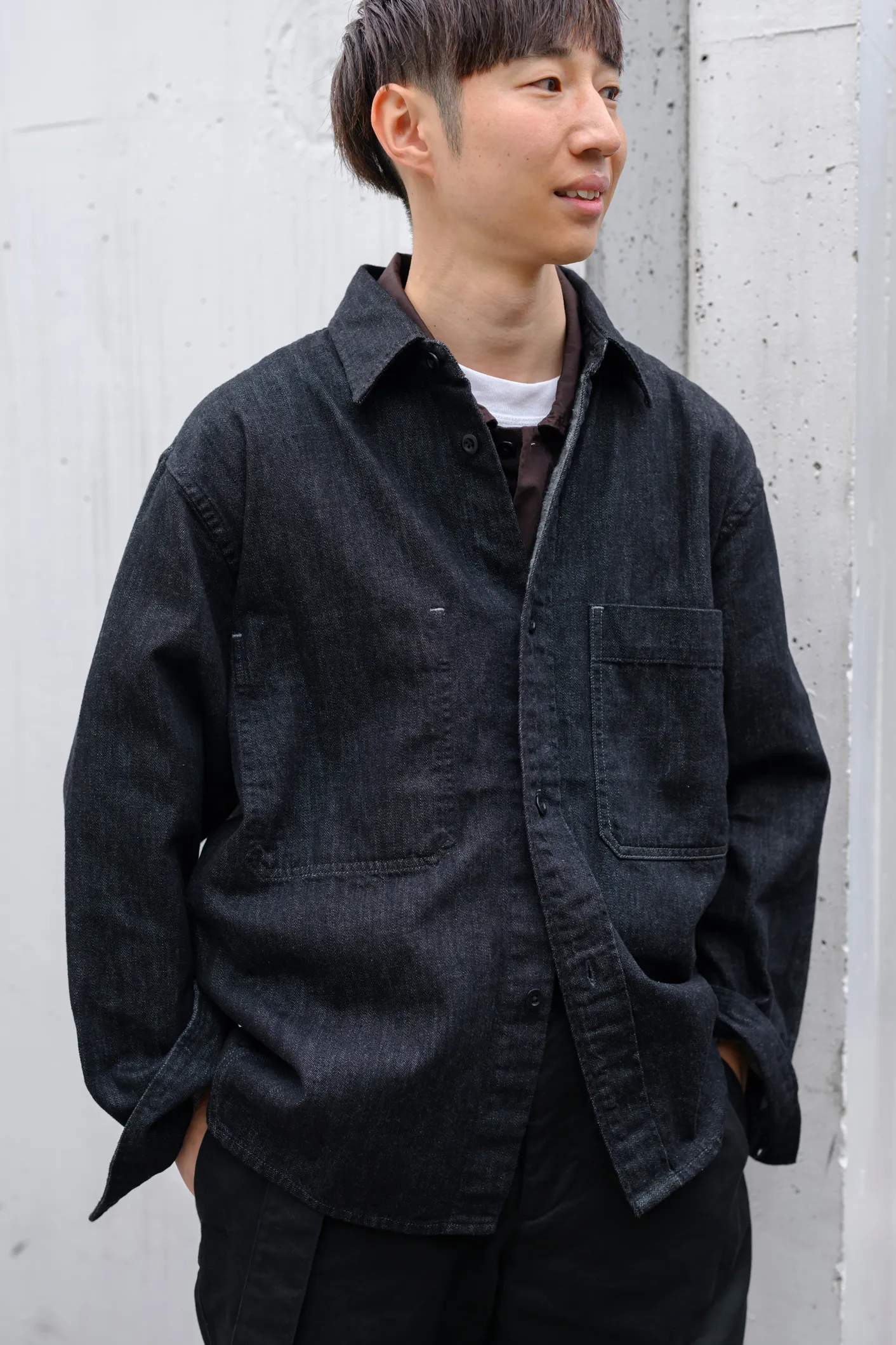 エボニーカラーのポロシャツをポイントに、襟付きシャツを重ねたコーディネート。春にブラックをメインにすると重く見えがちなので、インナーやシューズに明るい色を取り入れ、軽さを出しました。同じブラックでも素材感を変えることで、全体にメリハリが出ます。 BLACK LIGHT DENIM SHIRT ¥39,600