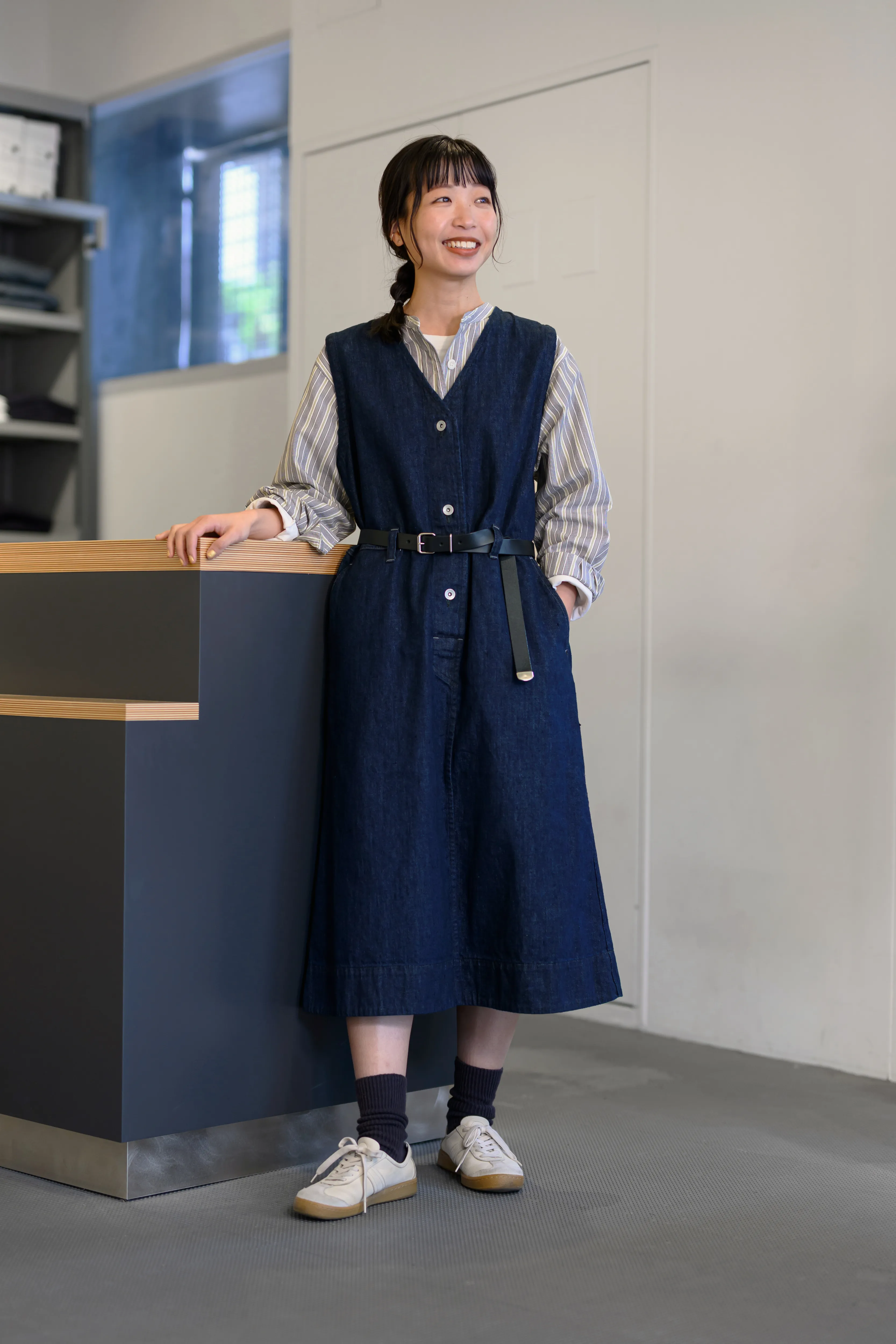 シンプルに着ても様になるドレスを、あえてインナーにストライプシャツを合わせてメンズライクに仕上げたスタイル。ベルトループを活かしてウエストマークし、袖口はラフにロールアップして、スニーカーで外した着こなしにしています。 LIGHT DENIM DRESS ¥44,000