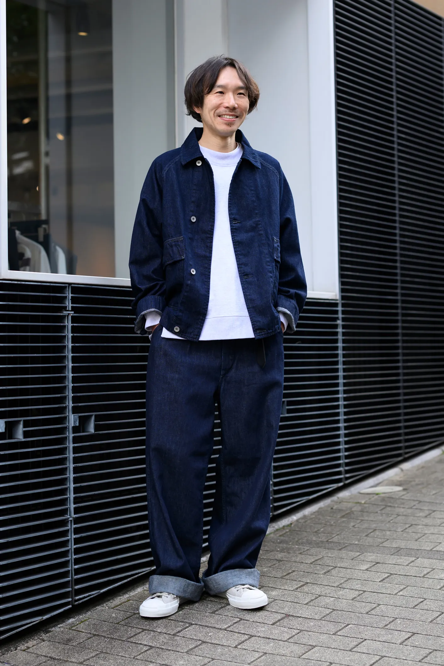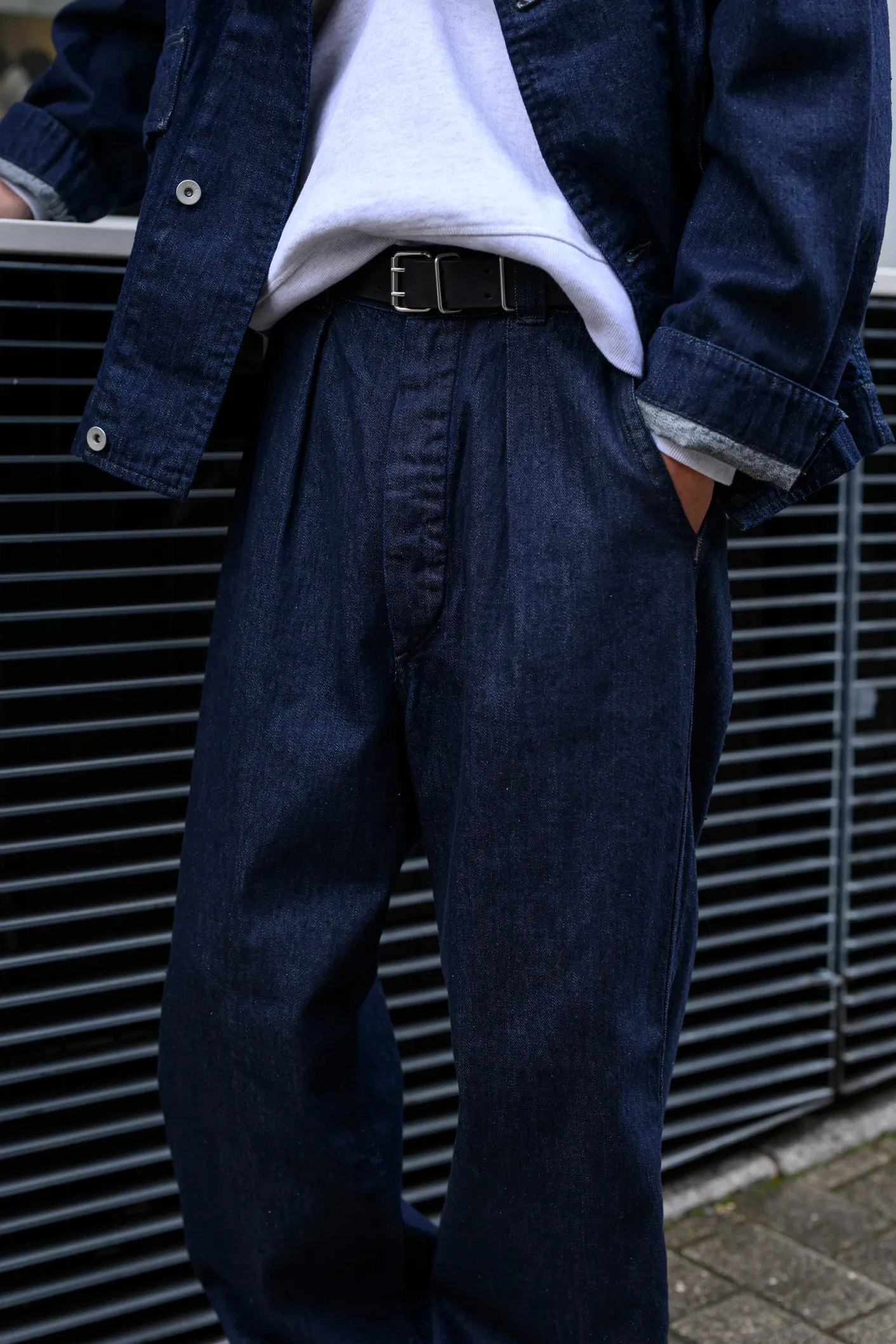タック入りのトラウザーズに、同素材のブルゾンを合わせたセットアップ。デニムのセットアップはハードな印象になりやすいですが、ホワイト杢のスウェットを合わせることで、軽さを意識しました。CANTON OVERALLSのデニムは、履き込むほどにきれいなタテ落ちが楽しめます。