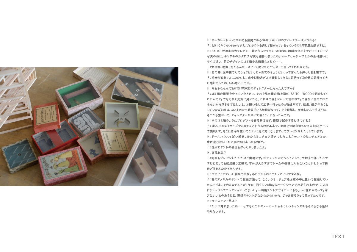 F:ゴミ箱の模型を作っていたときに、それを見た僕の元上司が、SAITO WOODを紹介してくれたんです。でもそれを先方に見せたら、これはできませんって言われて。できない理由がわからないから見させてほしいと、お願いをして工場へ行ったのが始まりです。結果、僕が作ろうとしていたゴミ箱は、コスト的にも時間的にも無理だなってことを理解し、断念したんですけどね。そこから繋がって、ディレクターをさせて頂くことになったんです。