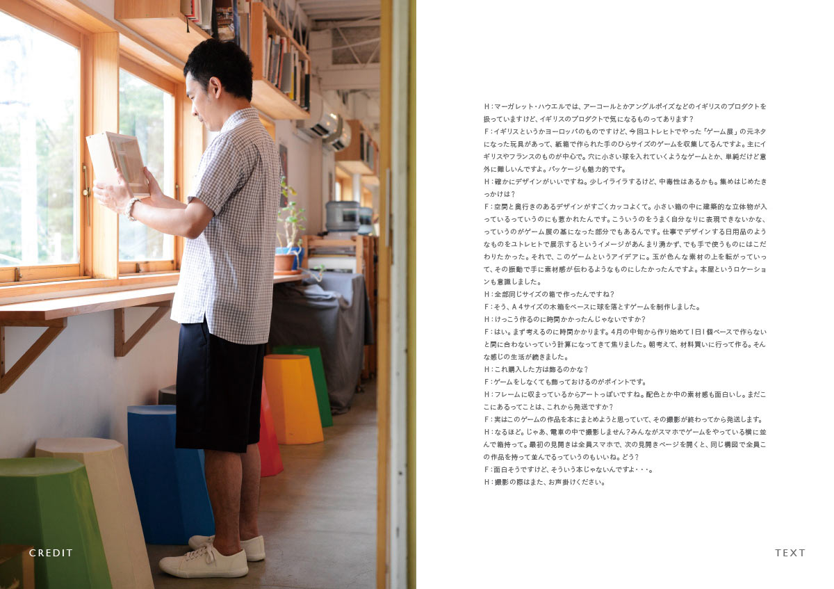 F:空間と奥行きのあるデザインがすごくカッコよくて。小さい箱の中に建築的な立体物が入っているっていうのにも惹かれたんです。こういうのをうまく自分なりに表現できないかな、っていうのがゲーム展の基になった部分でもあるんです。仕事でデザインする日用品のようなものをユトレヒトで展示するというイメージがあんまり湧かず、でも手で使うものにはこだわりたかった。それで、このゲームというアイデアに。玉が色んな素材の上を転がっていって、その振動で手に素材感が伝わるようなものにしたかったんですよ。本屋というロケーションも意識しました。