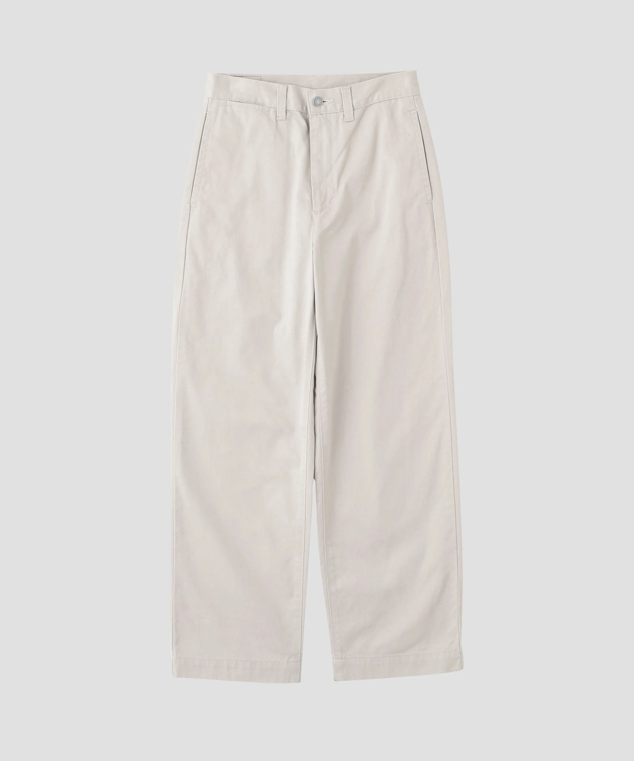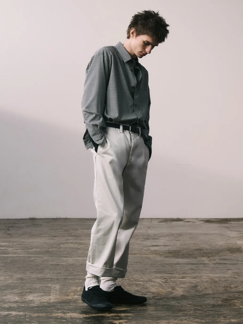 チノトラウザーズには、滑らかな光沢と柔らかさを加えた糸を使用し、ラフでありながらキャラクターのある素材を開発。仕上げにバイオウォッシュ加工を施すことにより、あたり感が出て、自然に馴染んだ風合いと色合いが生まれました。裾に向かって広がりがないシルエットなのでロールアップもしやすく様々なスタイルに合わせやすいデザインです。