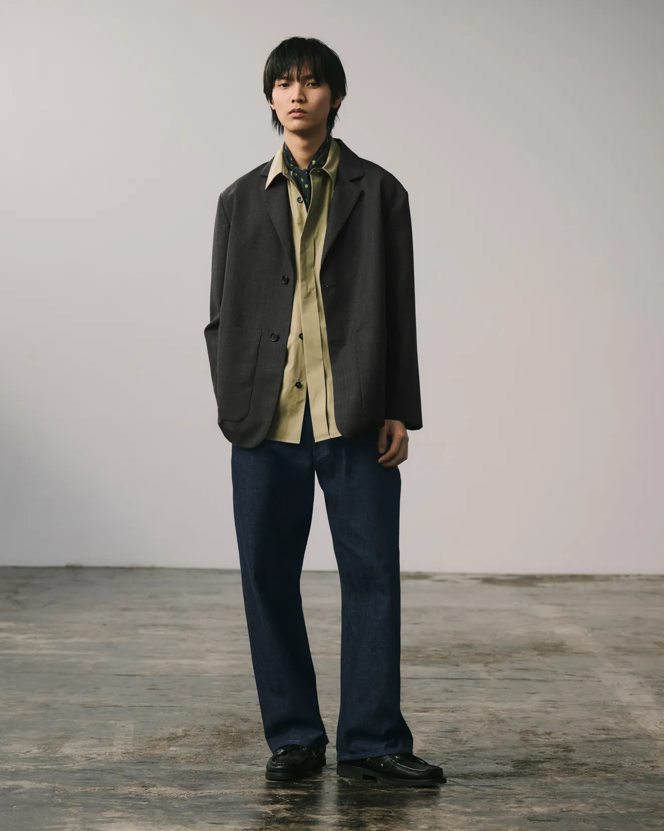 ジャケットは大きなパッチポケットや袖口はボタン留めの仕様で、マーガレット・ハウエルらしいディティールを採用。程よいゆとり感のあるフィットのスタイルです。