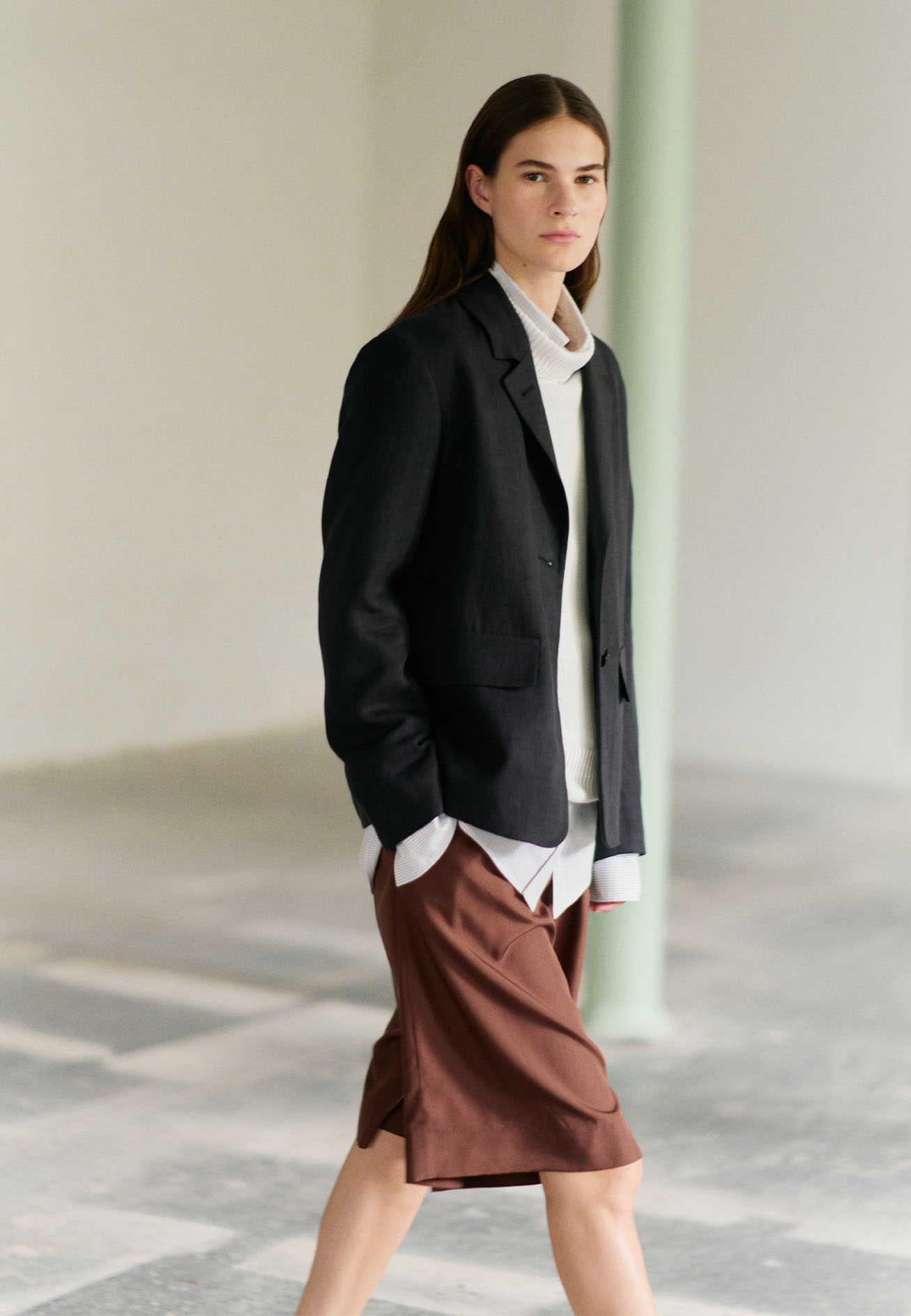 過去と今を見つめるコレクション。マーガレット・ハウエルらしいリラックスしたシルエットや伝統的な軽やかな素材、落ち着いたカラーパレットが特徴です。